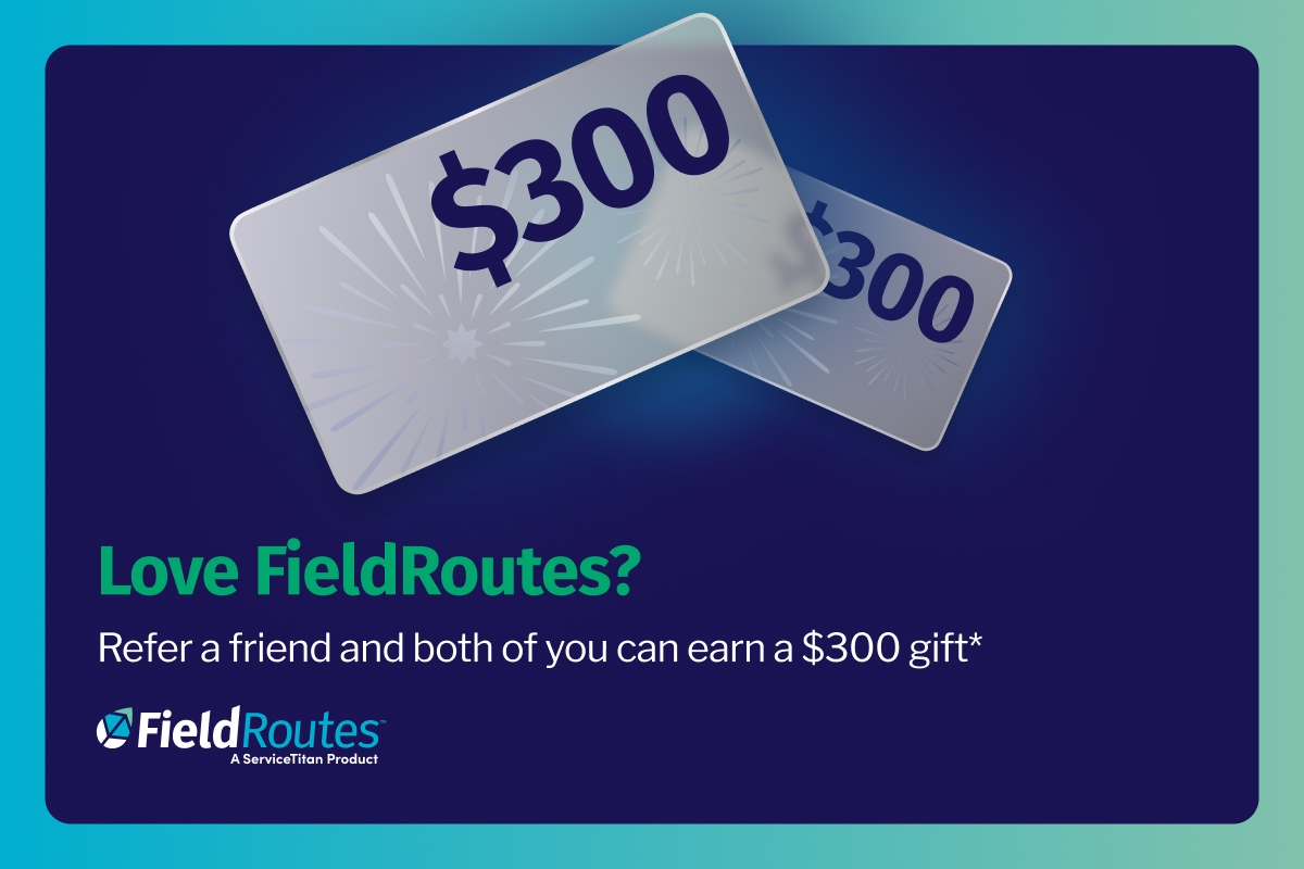 Did you know that when you refer FieldRoutes to your peers, it increases the likelihood that they’ll sign up with us? We can’t thank you enough for your recommendation, but we’d like to try. So, if you’re an active FieldRoutes customer, and you refer a new customer to us, you and your referral will both reap a reward once they become an active paying customer. It’s our way of thanking you both.